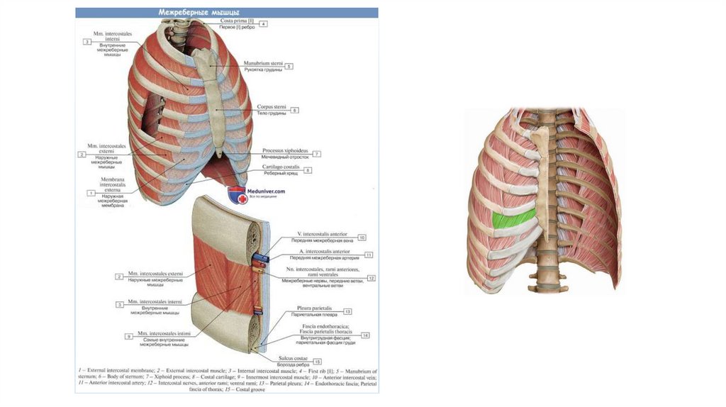 поверхности грудины и хрящей II–VII ребер (pars sternocostális) и, наконец, от