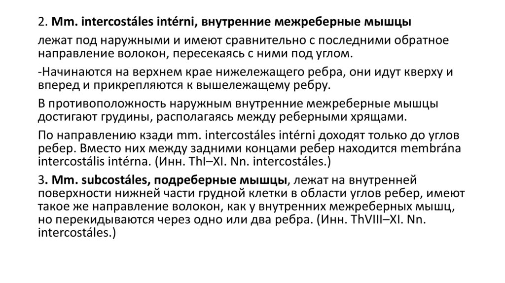 2. Mm. intercostáles intérni, внутренние межреберные мышцылежат под наружными и имеют сравнительно с последними обратное