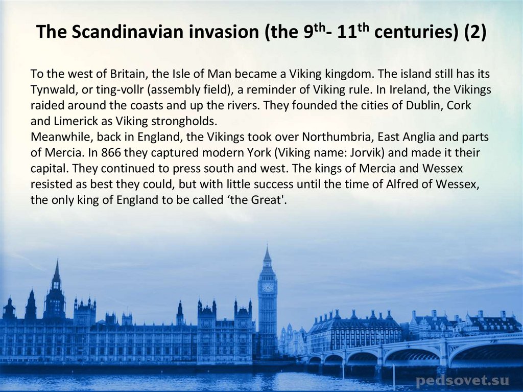The Scandinavian invasion (the 9th- 11th centuries) (2)To the west of Britain, the Isle of Man became a Viking kingdom. The island still has its