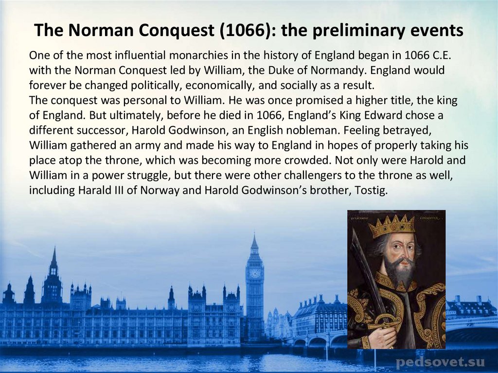 The Norman Conquest (1066): the preliminary eventsOne of the most influential monarchies in the history of England began in 1066 C.E.
