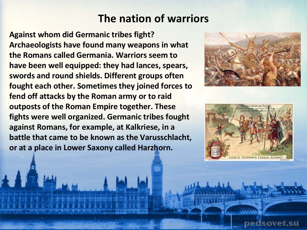 The nation of warriorsAgainst whom did Germanic tribes fight?