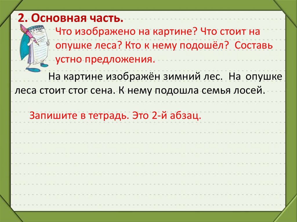 2. Основная часть.На картине изображён зимний лес. На опушке