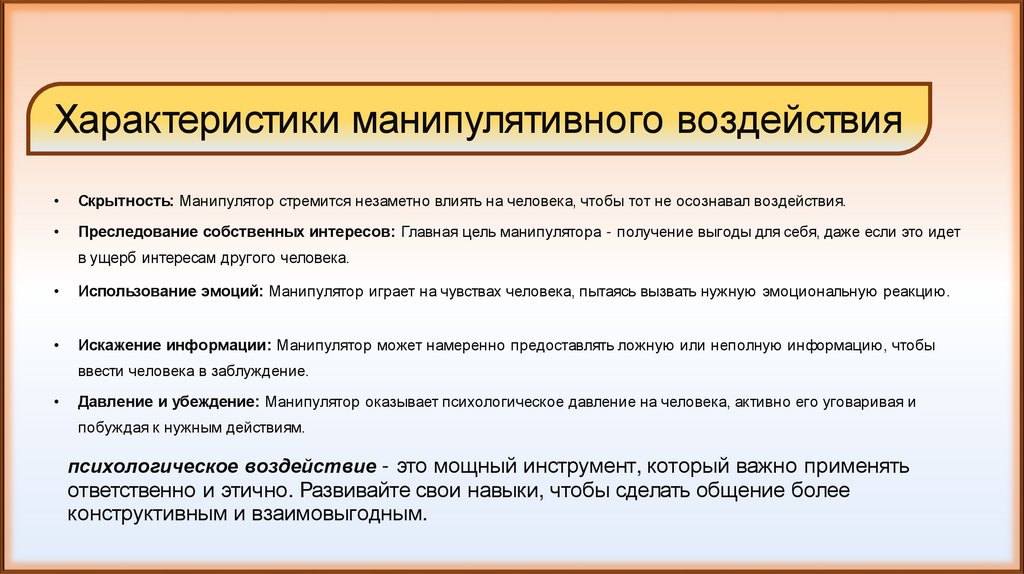 Характеристики манипулятивного воздействияСкрытность: Манипулятор стремится незаметно влиять на человека, чтобы тот не осознавал воздействия.