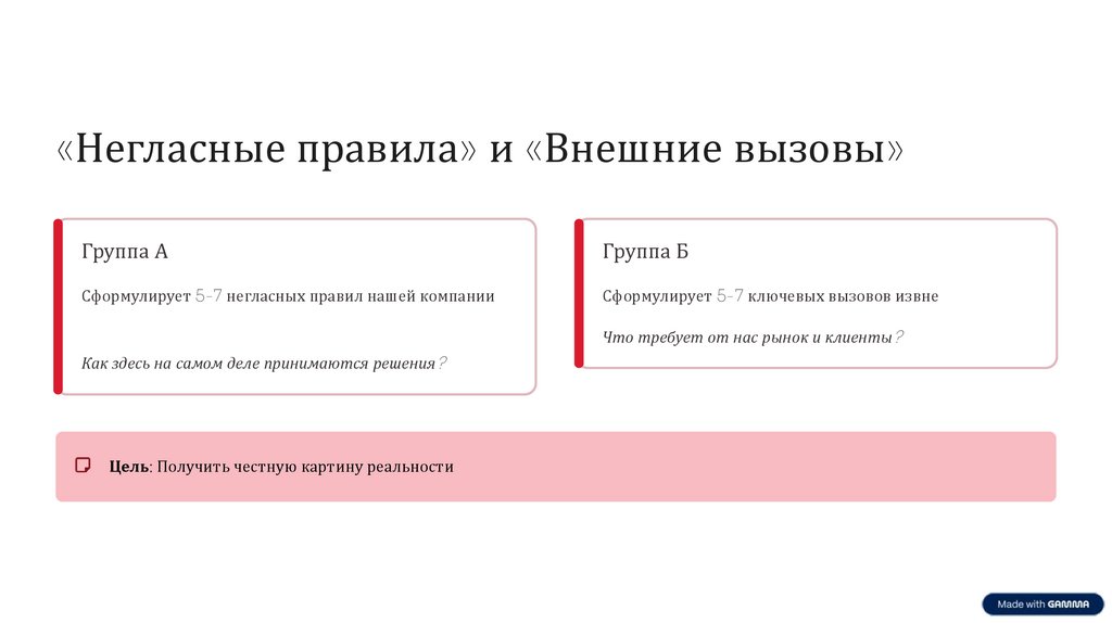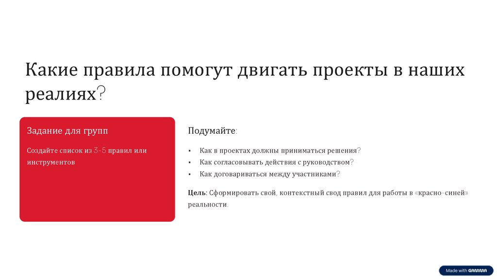 Цель: Сформировать свой, контекстный свод правил для работы в «красно-синей»