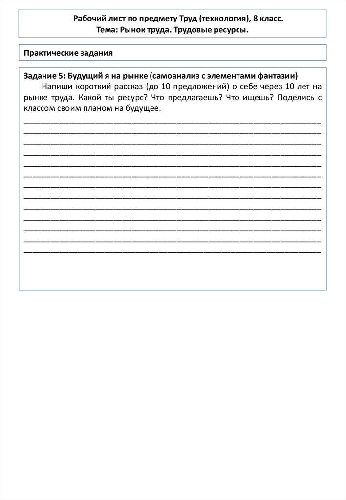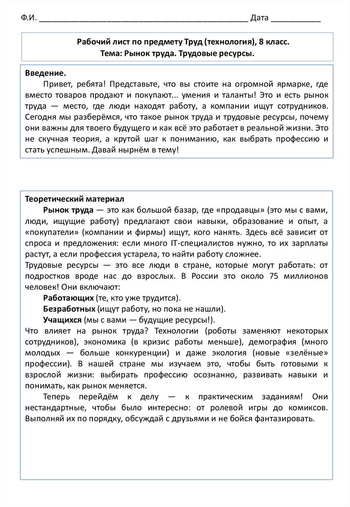 Рабочий лист по предмету Труд (технология), 8 класс.Тема: Рынок труда. Трудовые ресурсы.