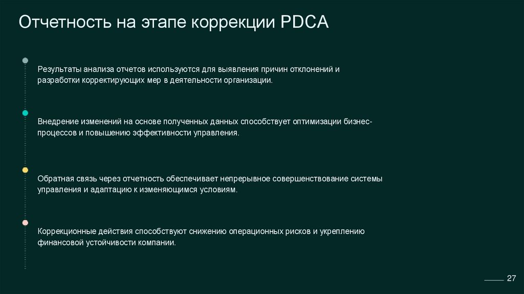 Отчетность на этапе коррекции PDCAРезультаты анализа отчетов используются для выявления причин отклонений и