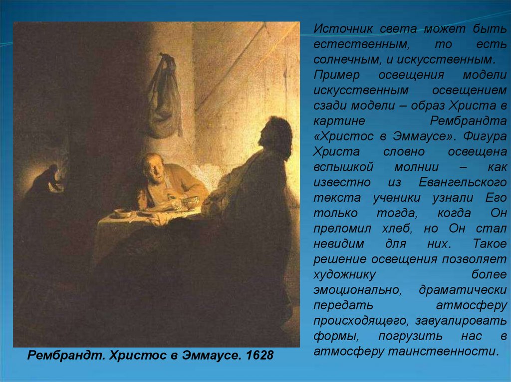 Рембрандт. Христос в Эммаусе. 1628Источник света может быть