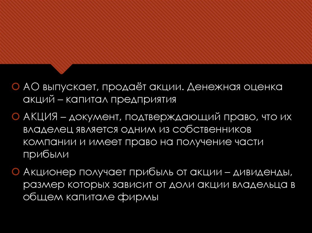 АО выпускает, продаёт акции. Денежная оценкаакций – капитал предприятия