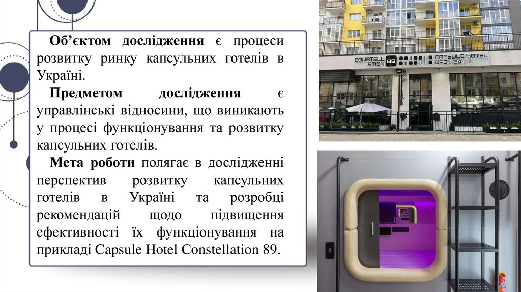 Об’єктом дослідження є процесирозвитку ринку капсульних готелів в