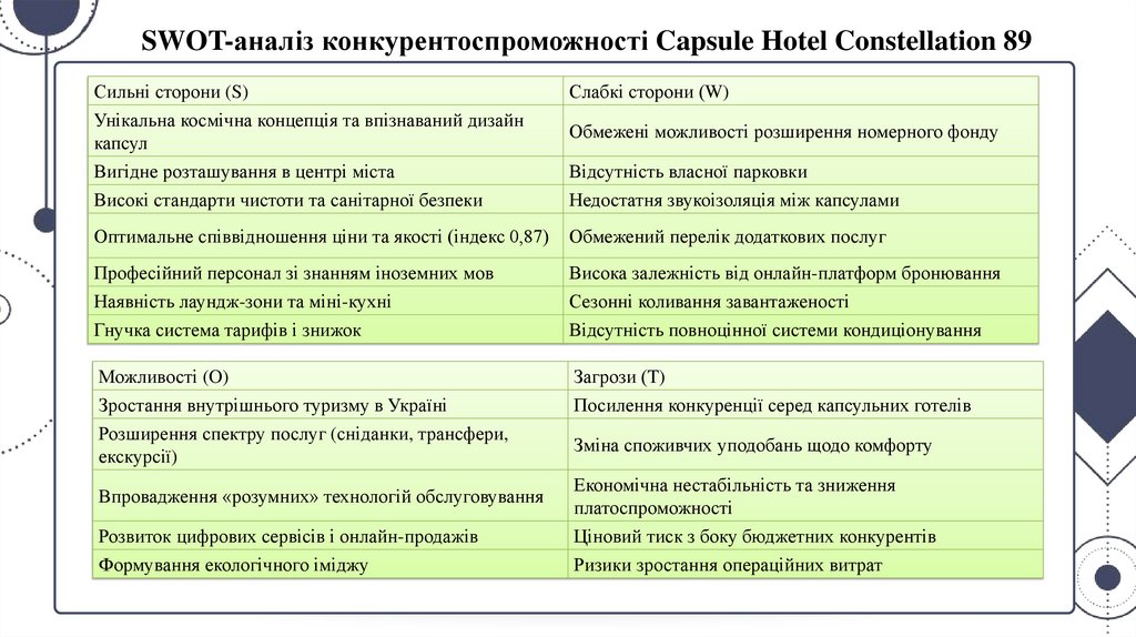 оцінено конкурентоспроможність Capsule Hotel Constellation 89 на українському ринку