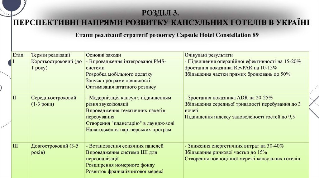 Етапи реалізації стратегії розвитку Capsule Hotel Constellation 89