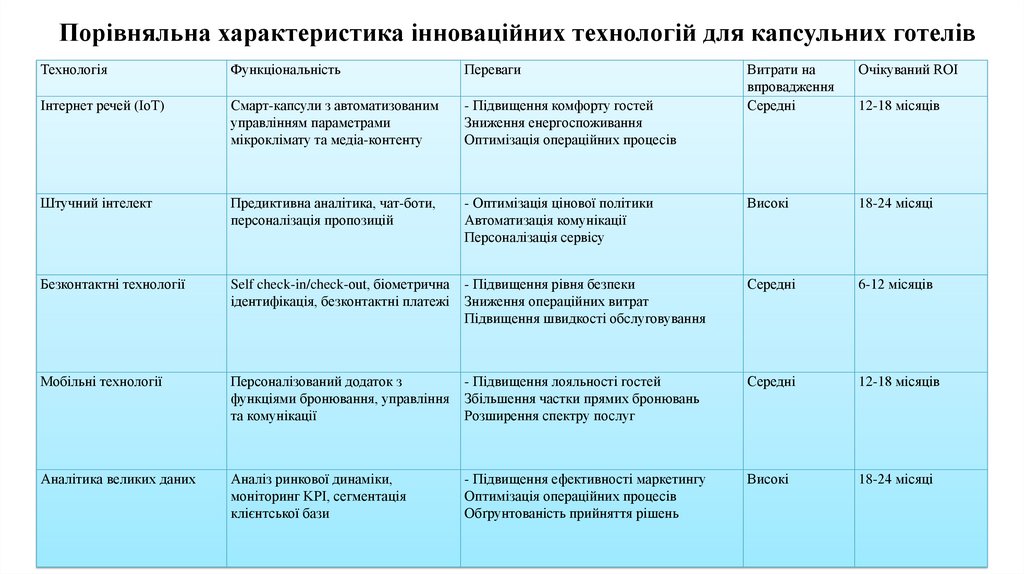 Порівняльна характеристика інноваційних технологій для капсульних готелівТехнологія