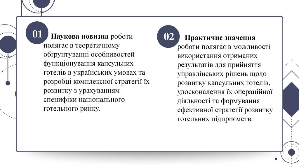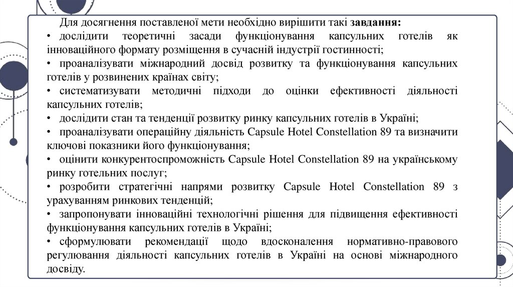 Для досягнення поставленої мети необхідно вирішити такі завдання:• дослідити теоретичні засади функціонування капсульних готелів як