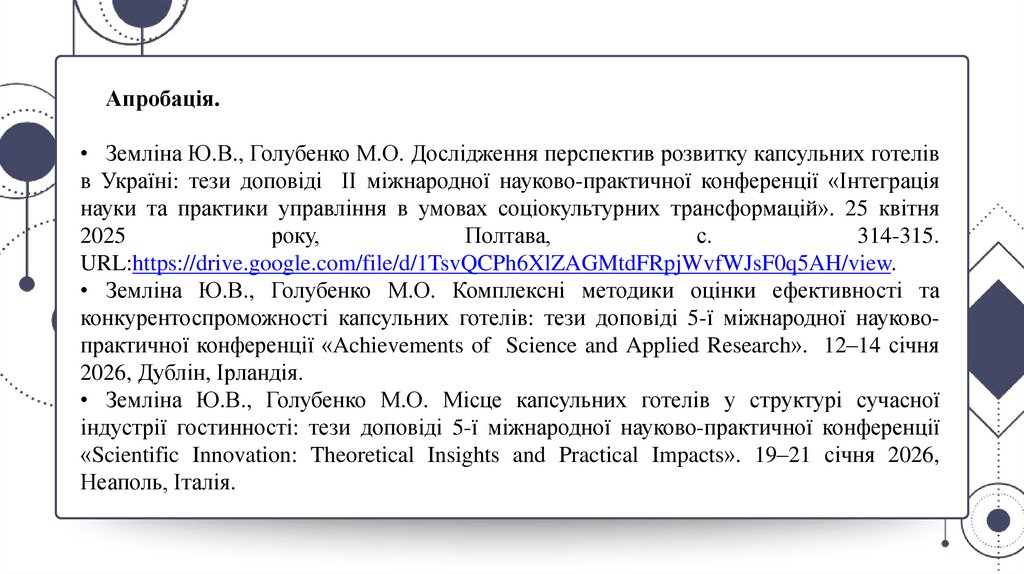 Апробація.• Земліна Ю.В., Голубенко М.О. Дослідження перспектив розвитку капсульних готелів