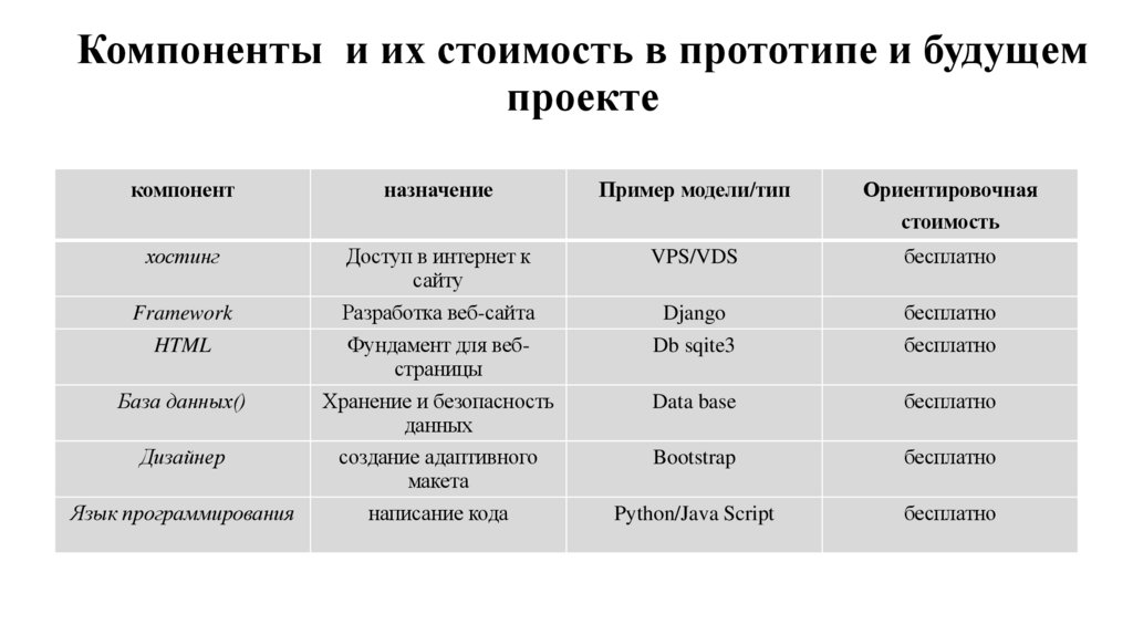 Компоненты и их стоимость в прототипе и будущемпроекте