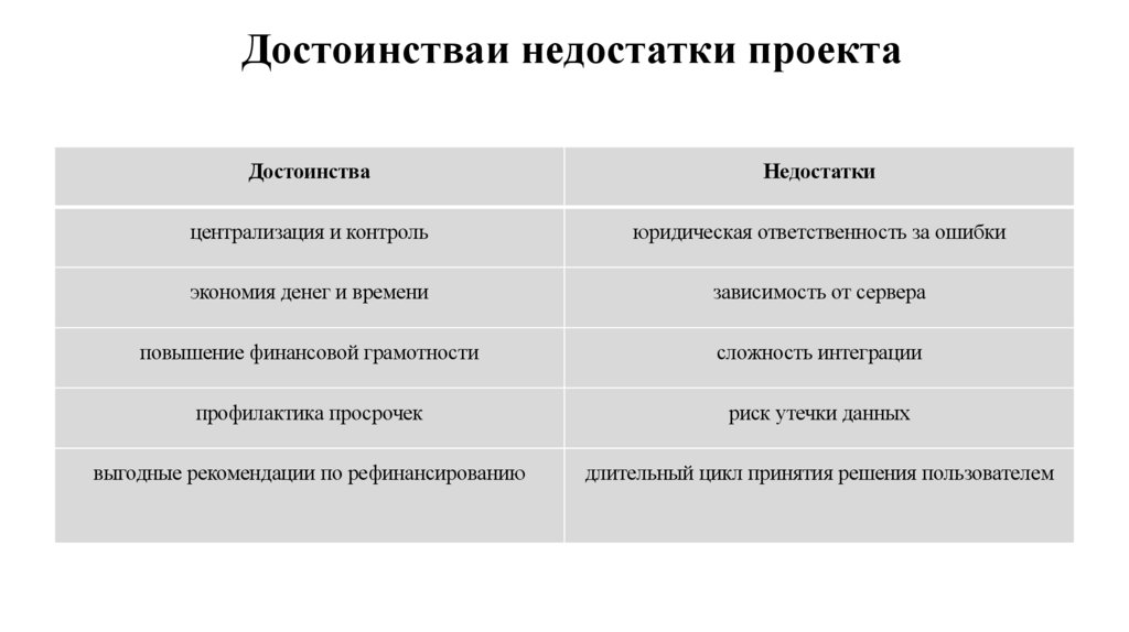 Достоинстваи недостатки проектаДостоинства