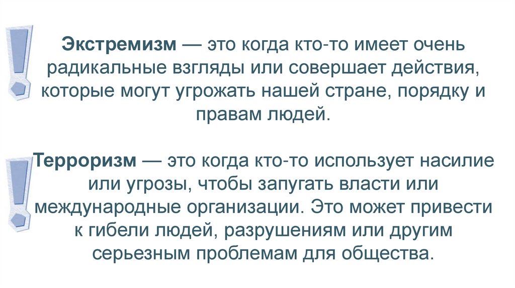 Экстремизм — это когда кто-то имеет оченьрадикальные взгляды или совершает действия,