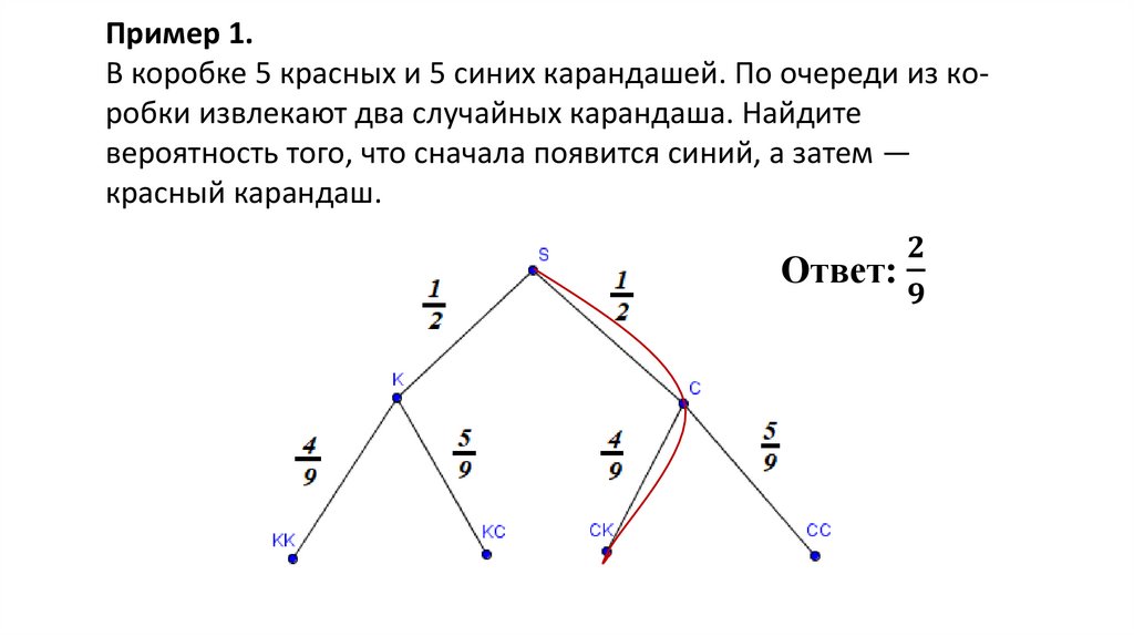 Пример 1.В коробке 5 красных и 5 синих карандашей. По очереди из коробки извлекают два случайных карандаша. Найдите