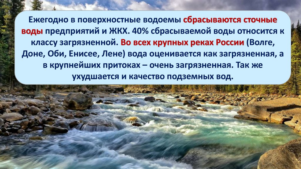Ежегодно в поверхностные водоемы сбрасываются сточныеводы предприятий и ЖКХ. 40% сбрасываемой воды относится к