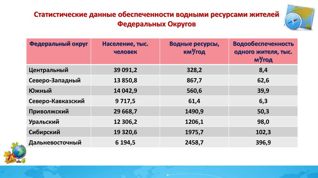 Статистические данные обеспеченности водными ресурсами жителейФедеральных Округов