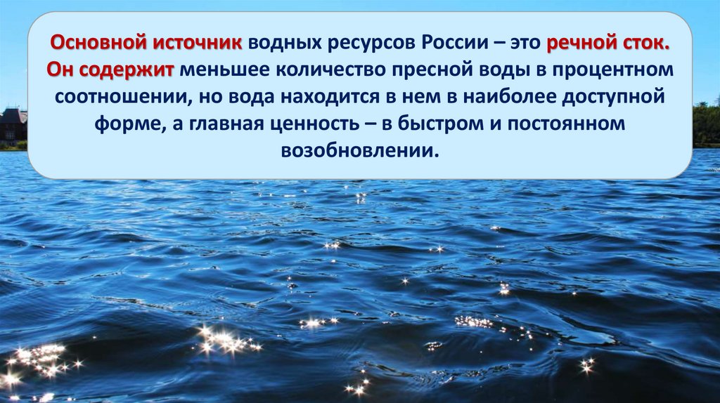 Основной источник водных ресурсов России – это речной сток.Он содержит меньшее количество пресной воды в процентном