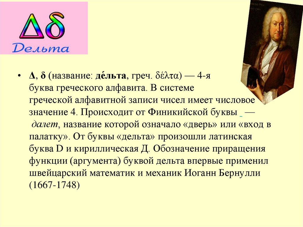 • Δ, δ (название: де́льта, греч. δέλτα) — 4-ябуква греческого алфавита. В системе