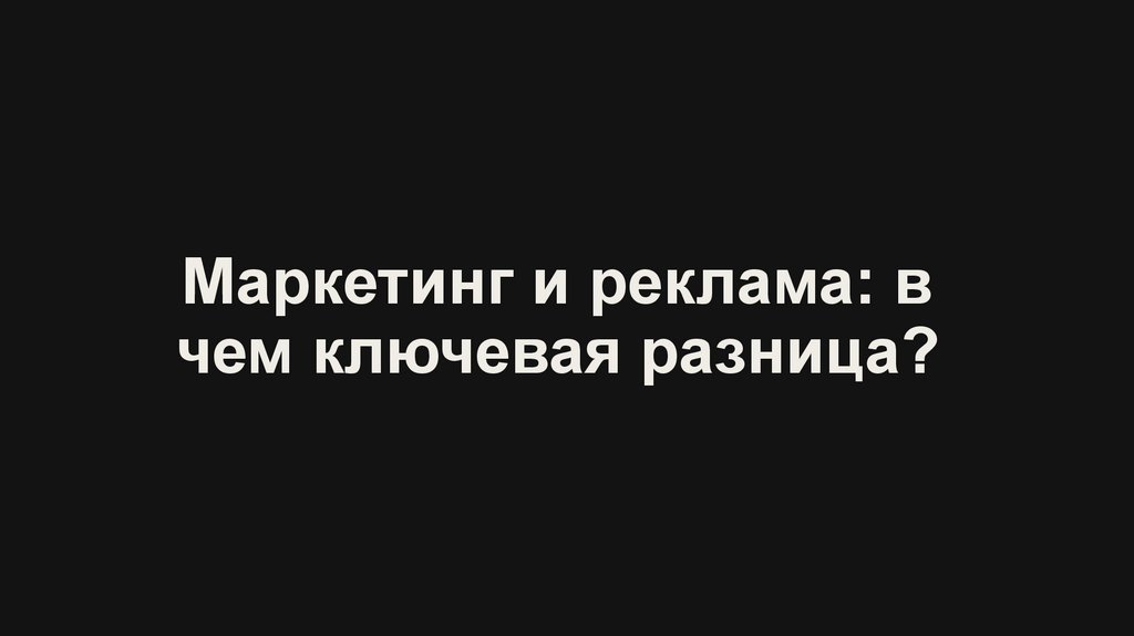• Маркетинг — это комплексная стратегия бизнеса (включая продукт,цену, аудиторию), в то время как реклама — лишь её тактическая