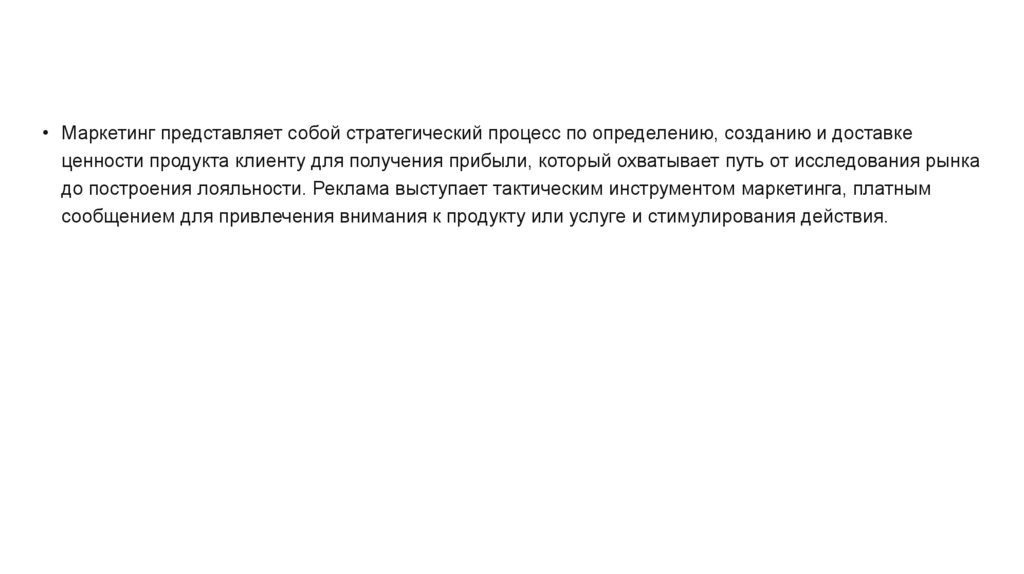 • Маркетинг представляет собой стратегический процесс по определению, созданию и доставкеценности продукта клиенту для получения прибыли, который охватывает путь от исследования рынка