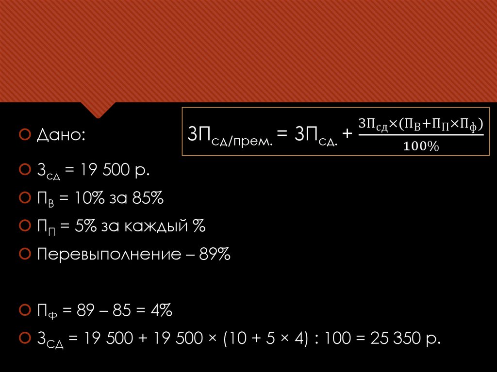 ЗПсд/регр. = ЗПсд. + Рсд. × (ПП1 : K1 + ПП2 : K2 ...)25 200 + 225 × (10 : 1,3 + 9 : 1,2) = 25 200 + 225 × 15,2 =