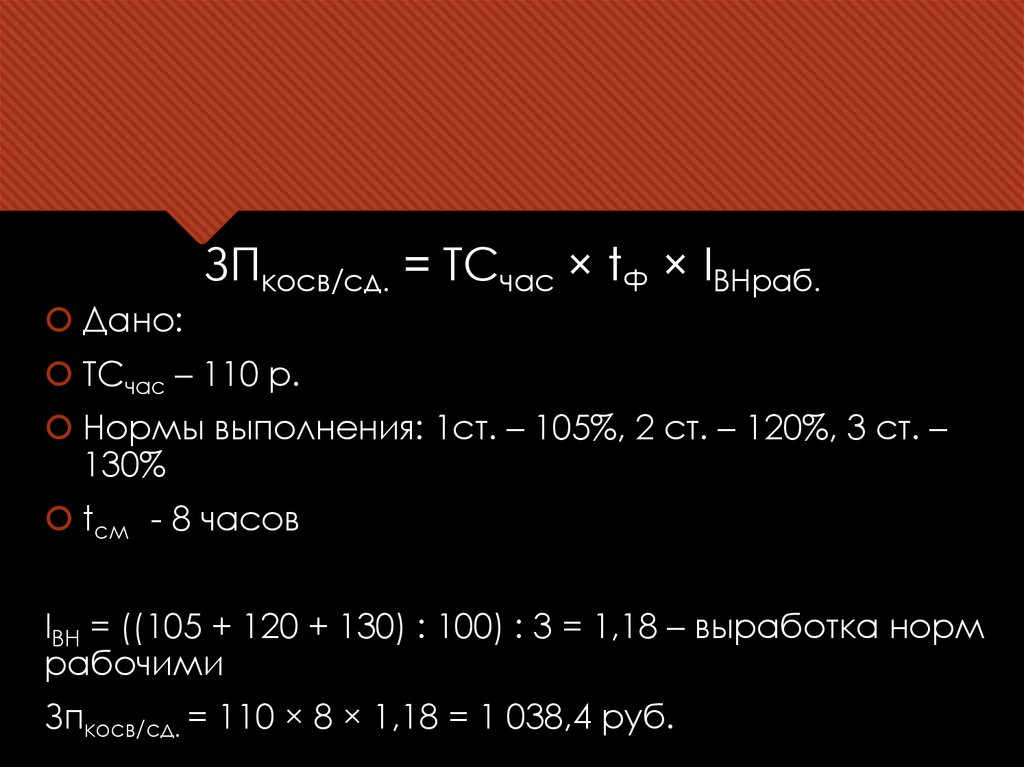 Дано:ЗПкосв/сд. = ТСчас × tФ × IВНраб.