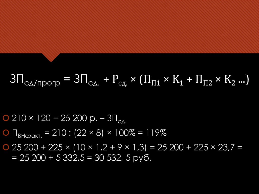 ЗПсд/прогр = ЗПсд. + Рсд. × (ПП1 × K1 + ПП2 × K2 ...)210 × 120 = 25 200 р. – ЗПсд.