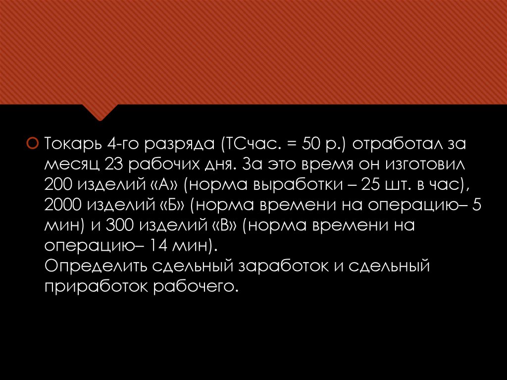 Токарь 4-го разряда (ТСчас. = 50 р.) отработал замесяц 23 рабочих дня. За это время он изготовил