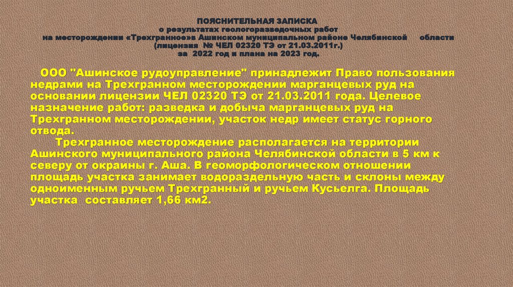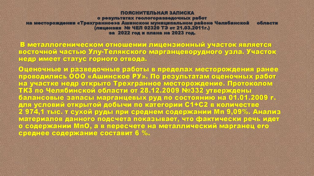 ПОЯСНИТЕЛЬНАЯ ЗАПИСКАо результатах геологоразведочных работ