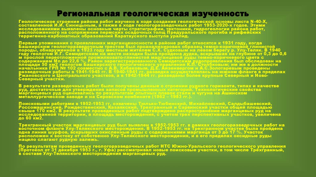 Региональная геологическая изученностьГеологическое строение района работ изучено в ходе создания геологической основы листа N-40-X,