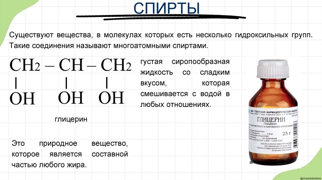 СПИРТЫСуществуют вещества, в молекулах которых есть несколько гидроксильных групп.