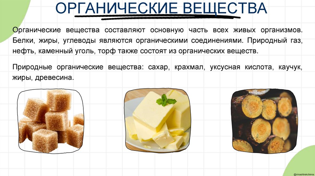 Природные органические вещества: сахар, крахмал, уксусная кислота, каучук,