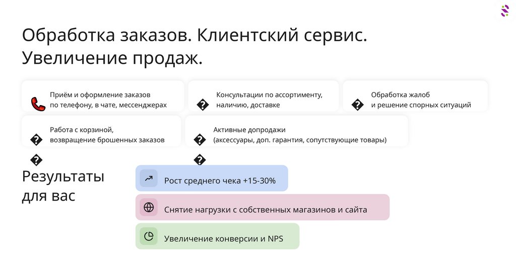 Обработка заказов. Клиентский сервис.Увеличение продаж.