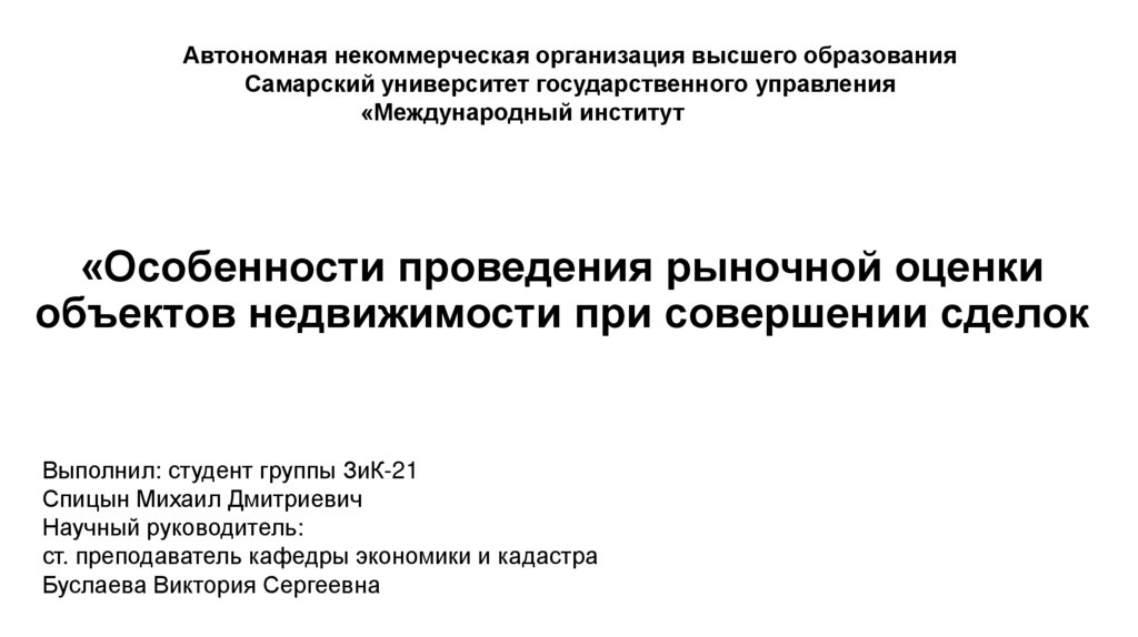 1. «Особенности проведения рыночной оценки объектов недвижимости при совершении сделок