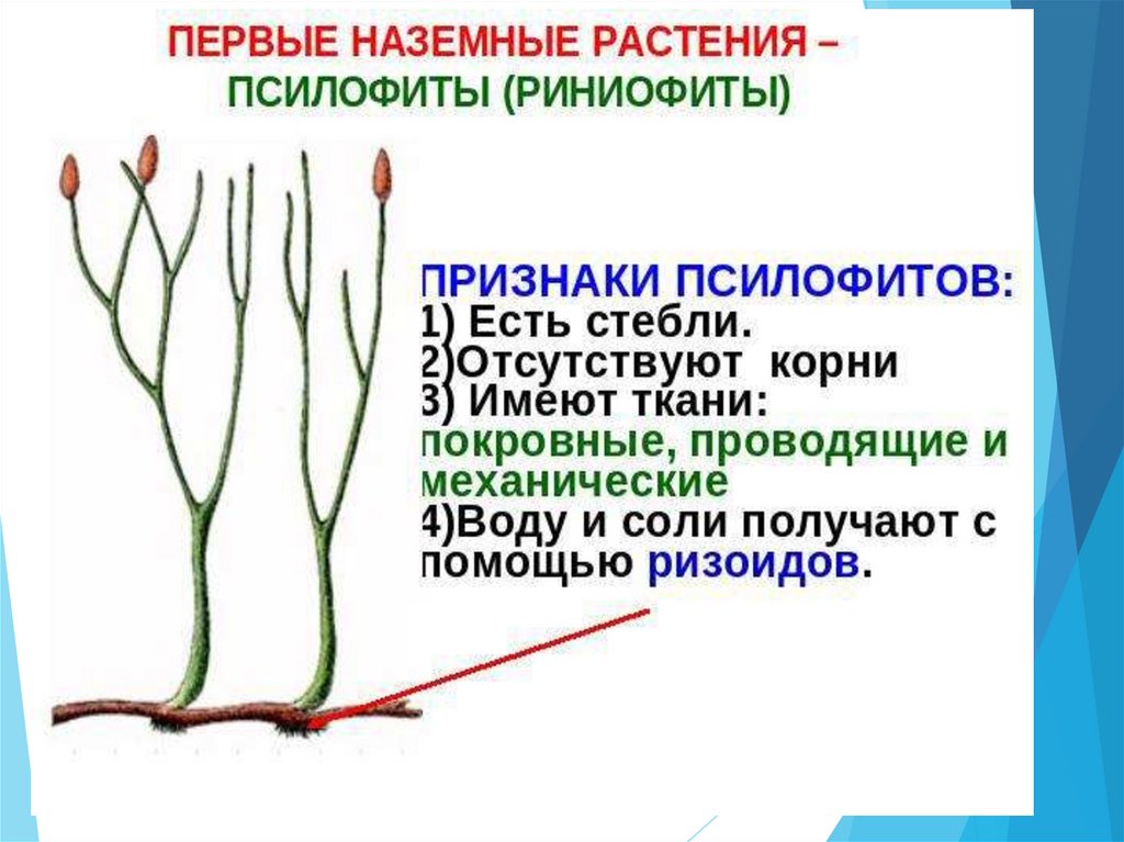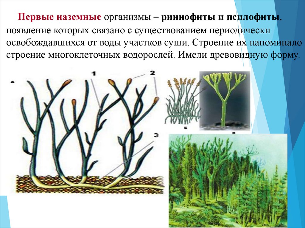 Первые наземные организмы – риниофиты и псилофиты,появление которых связано с существованием периодически