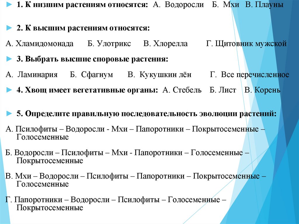 ► 1. К низшим растениям относятся: А. ВодорослиГ. Хвощи