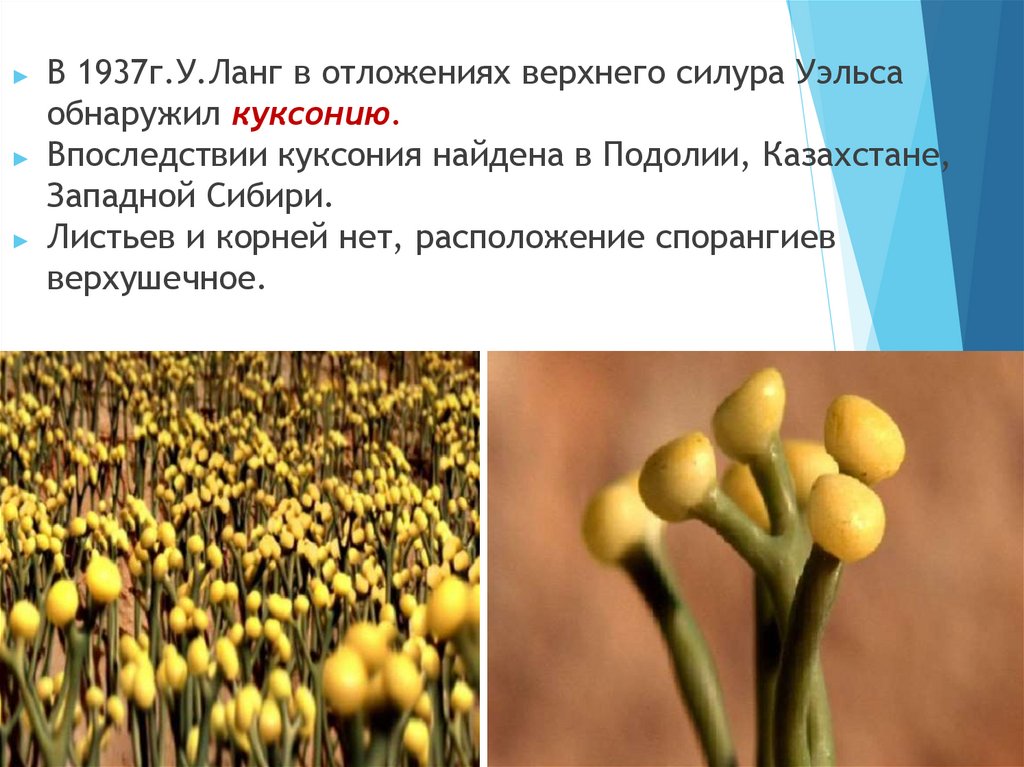 В 1937г.У.Ланг в отложениях верхнего силура Уэльсаобнаружил куксонию.