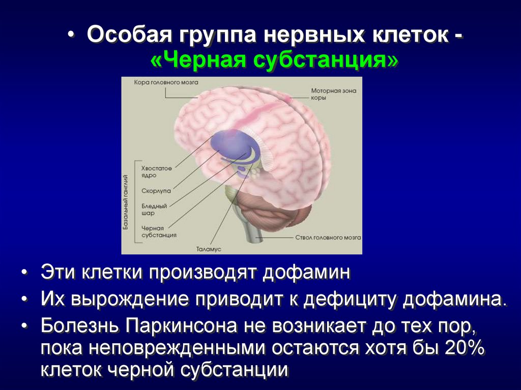 • Особая группа нервных клеток «Черная субстанция»• Эти клетки производят дофамин