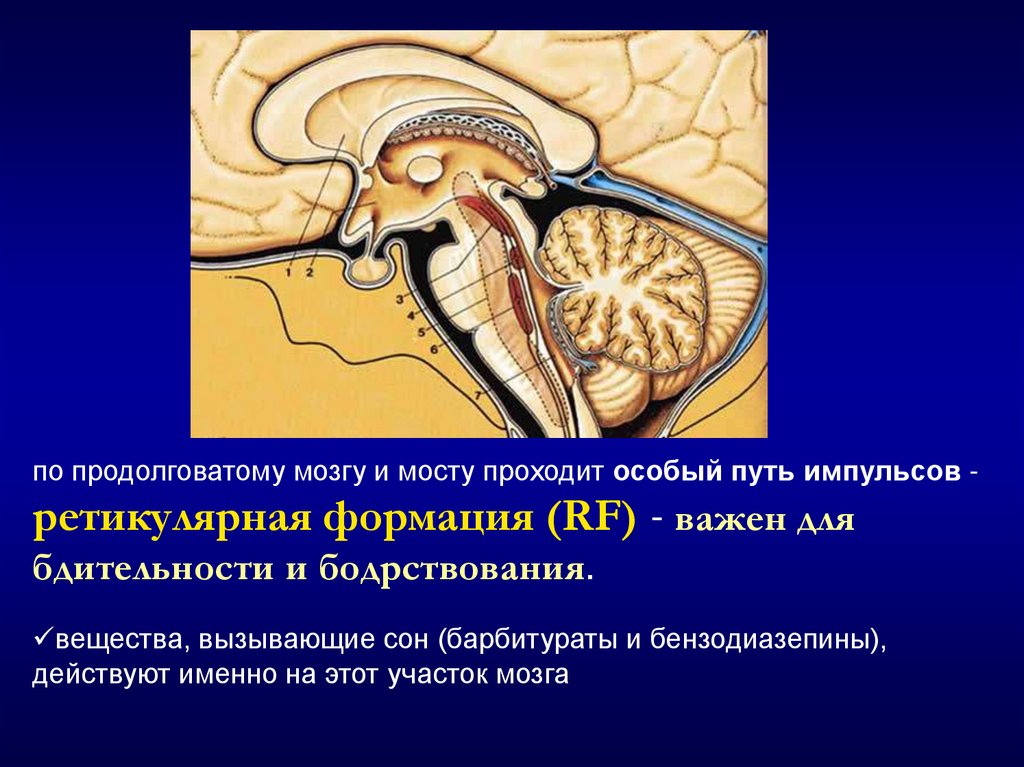 по продолговатому мозгу и мосту проходит особый путь импульсов -ретикулярная формация (RF) - важен для