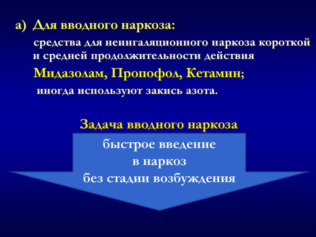 a) Для вводного наркоза:средства для неингаляционного наркоза короткой