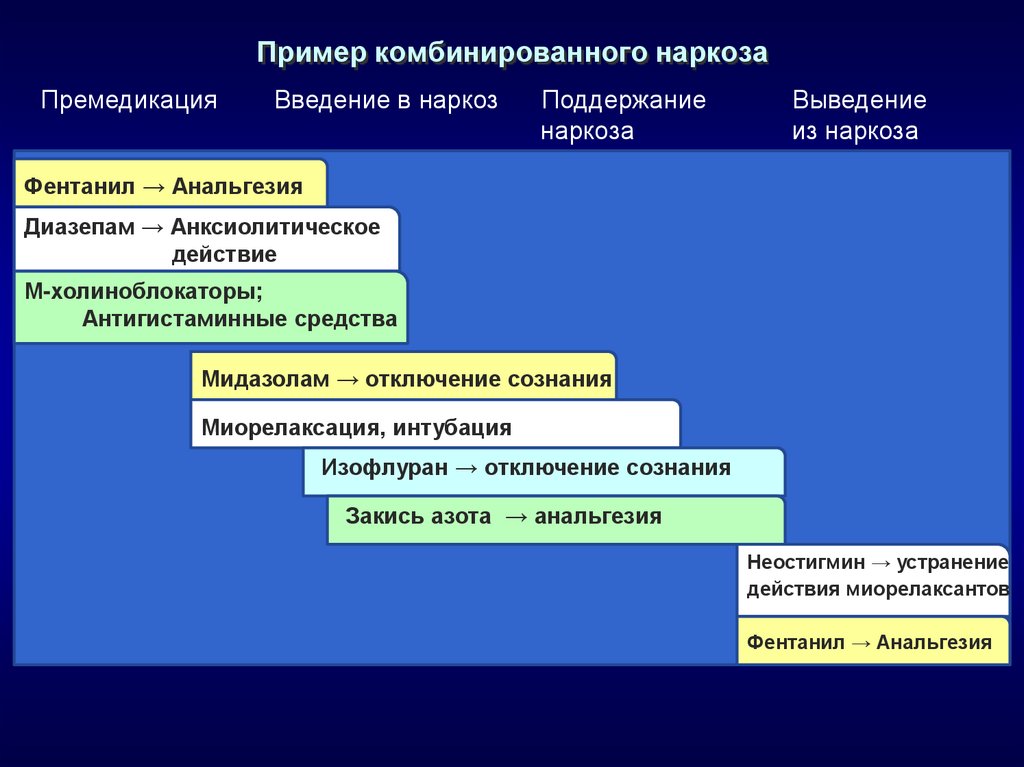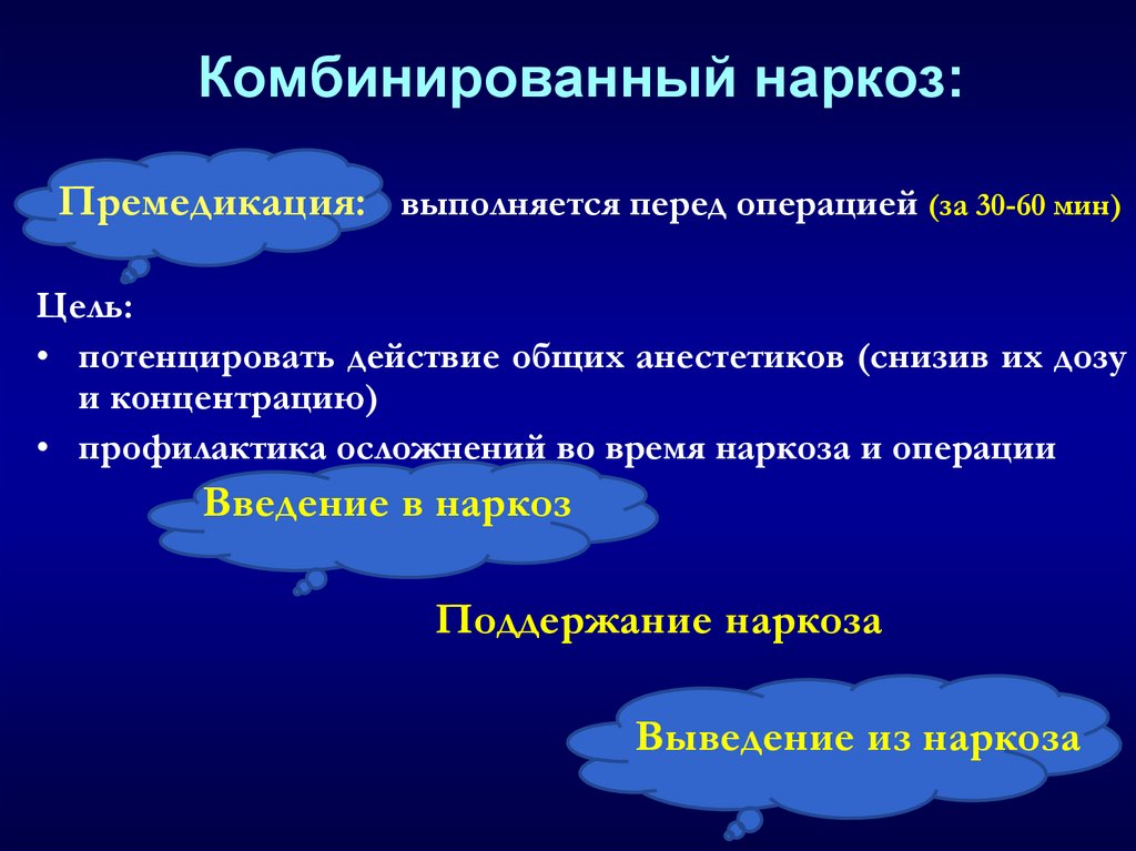 Комбинированный наркоз:Премедикация: выполняется перед операцией (за 30-60 мин)