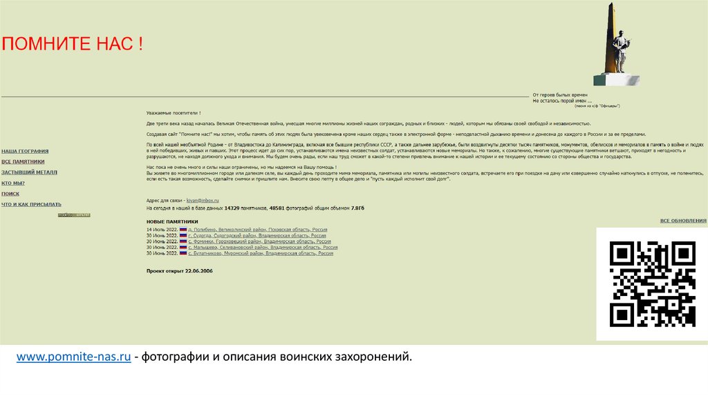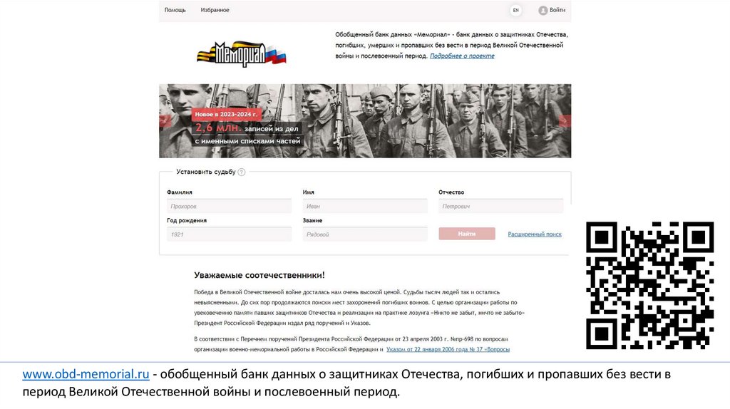 www.obd-memorial.ru - обобщенный банк данных о защитниках Отечества, погибших и пропавших без вести впериод Великой Отечественной войны и послевоенный период.