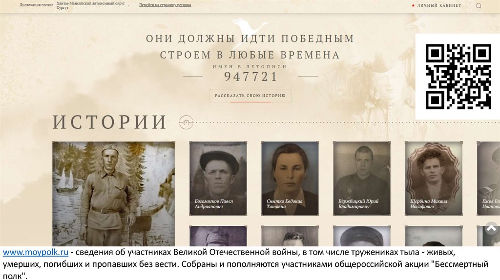www.moypolk.ru - сведения об участниках Великой Отечественной войны, в том числе тружениках тыла - живых,умерших, погибших и пропавших без вести. Собраны и пополняются участниками общероссийской акции "Бессмертный