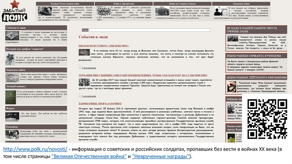 http://www.polk.ru/novosti/ - информация о советских и российских солдатах, пропавших без вести в войнах XX века (втом числе страницы "Великая Отечественная война" и "Неврученные награды").