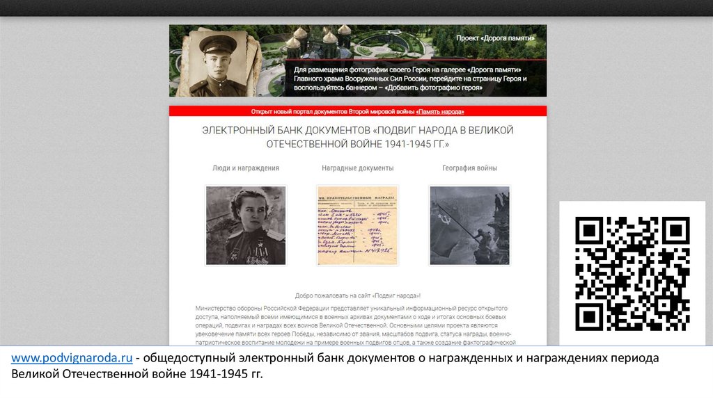 www.podvignaroda.ru - общедоступный электронный банк документов о награжденных и награждениях периодаВеликой Отечественной войне 1941-1945 гг.