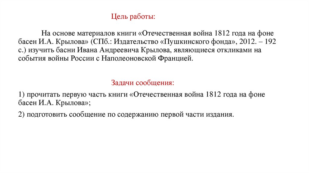 Цель работы:На основе материалов книги «Отечественная война 1812 года на фоне